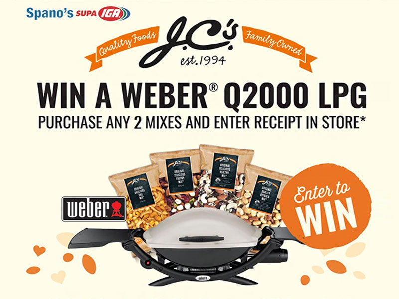 *Only J.C.’s Quality Foods mixes from 250g – 500g apply. Competition opens 01/05/17 and closes 30/06/17. Must include your name, phone number and email address on the back of the receipt and places into entry box in store. Draw will take place in store the week of 30/06/17. Winner will be notified by phone.
